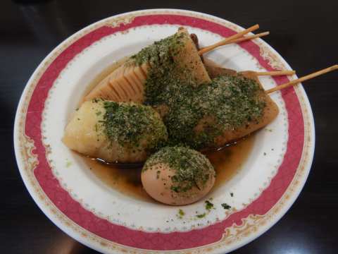 もつ串、黒はんぺん、ロールキャベツ、白はんぺん、たけのこにたまご。