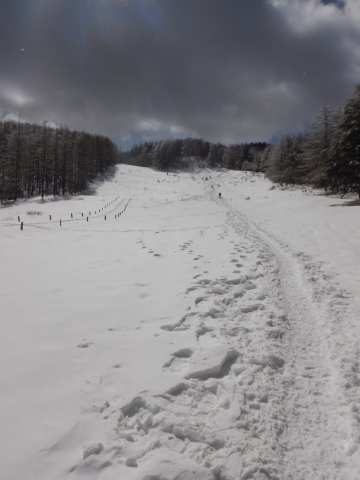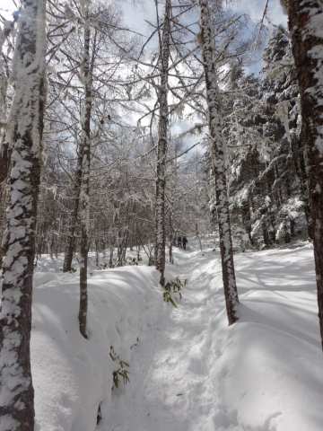 仏平峠で林道に出る。ここまで来ると踏み後は少なくスノーシューのありがたさを実感する。ほぼ誰もいなくて静かな雪道を黙々と歩く。よい時間だ。
