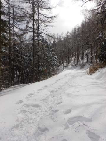 山小屋を過ぎてから勾配が少しきつくなり雪景色の森を歩く。