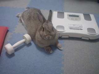 体重計(人間用)とダンベル(木製。うさぎのかじり木)に挟まれて何を考えてるのやら・・・ |